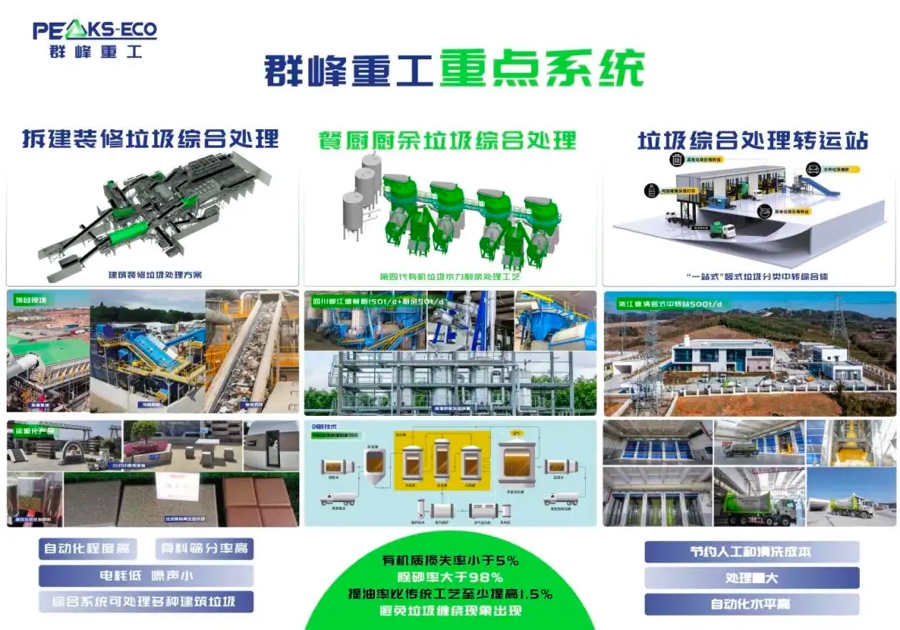 一条生产线分时处置多种建筑、装修、尾矿、大件等无机类垃圾,节省能耗、节省项目投资、自动化程度较高。